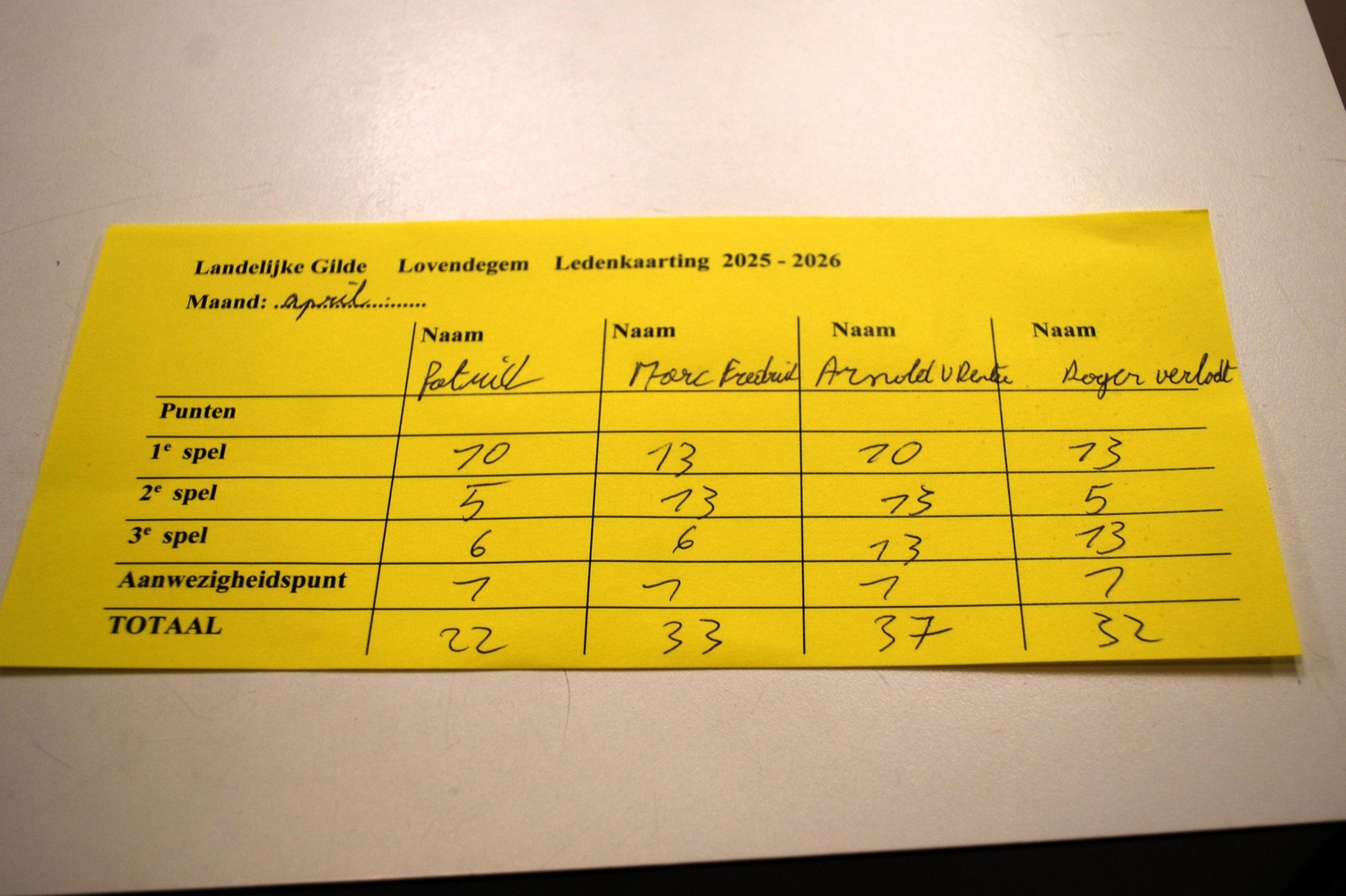 De kampioen van het seizoen 2025 -2026 voor onze gilde was Marc Van Speybroeck. Arnold Van Renterghem en André Verlodt werden verdienstelijk 2de en 3de.